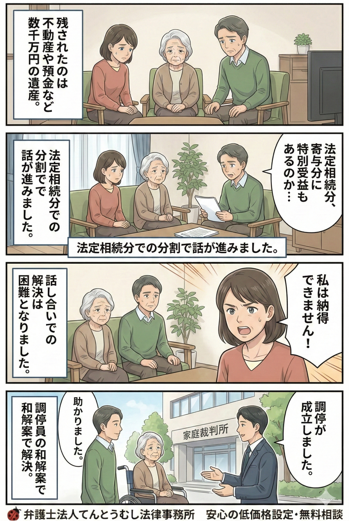 しかし、相続人の一人が、法定相続分以上の分配を主張したため、話し合いでの解決を断念し、遺産分割調停を申し立てた結果、比較的短期間で解決することが出来ました。